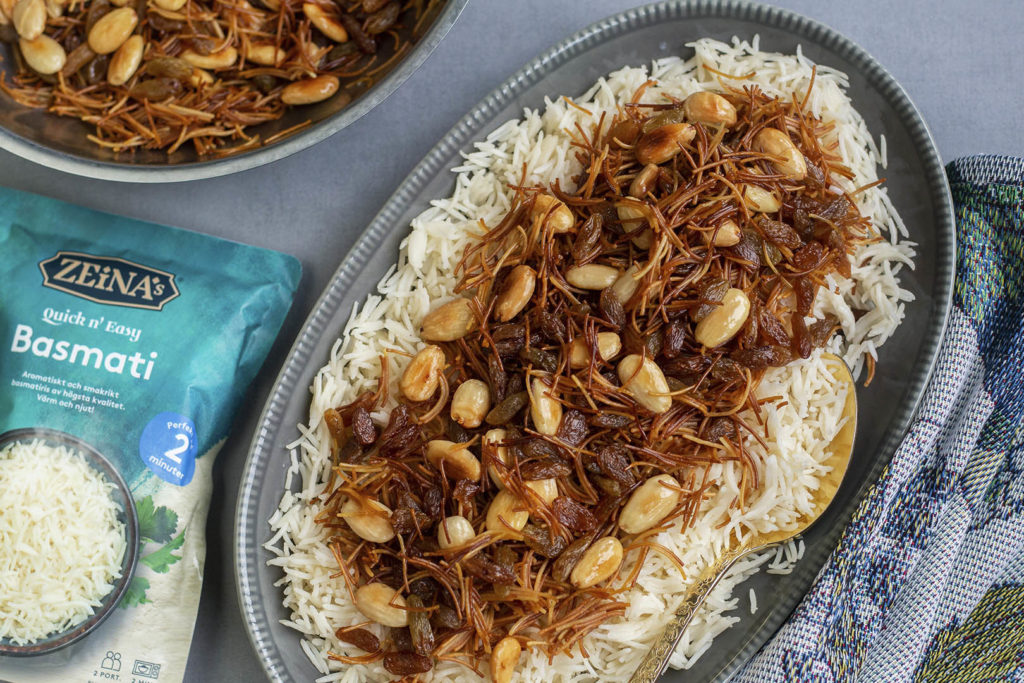 Ris med gyllene vermicelli, mandel och russin